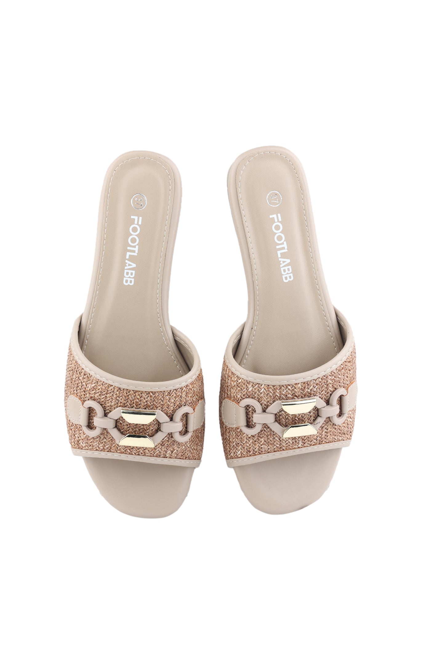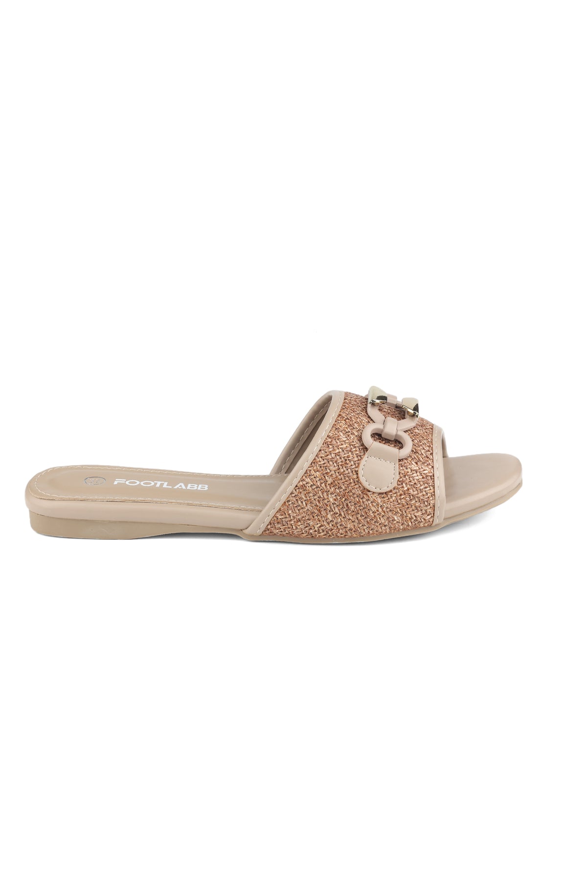 Footlabb women flats, beige slip-on sandals, stylish woven slides, faux leather ladies slippers, Footlabb casual footwear, comfortable silicon sole flats, office wear sandals for women, designer buckle flats, Footlabb trendy slides, lightweight summer footwear, elegant women slippers.