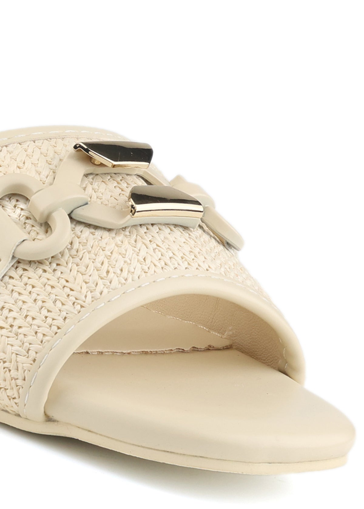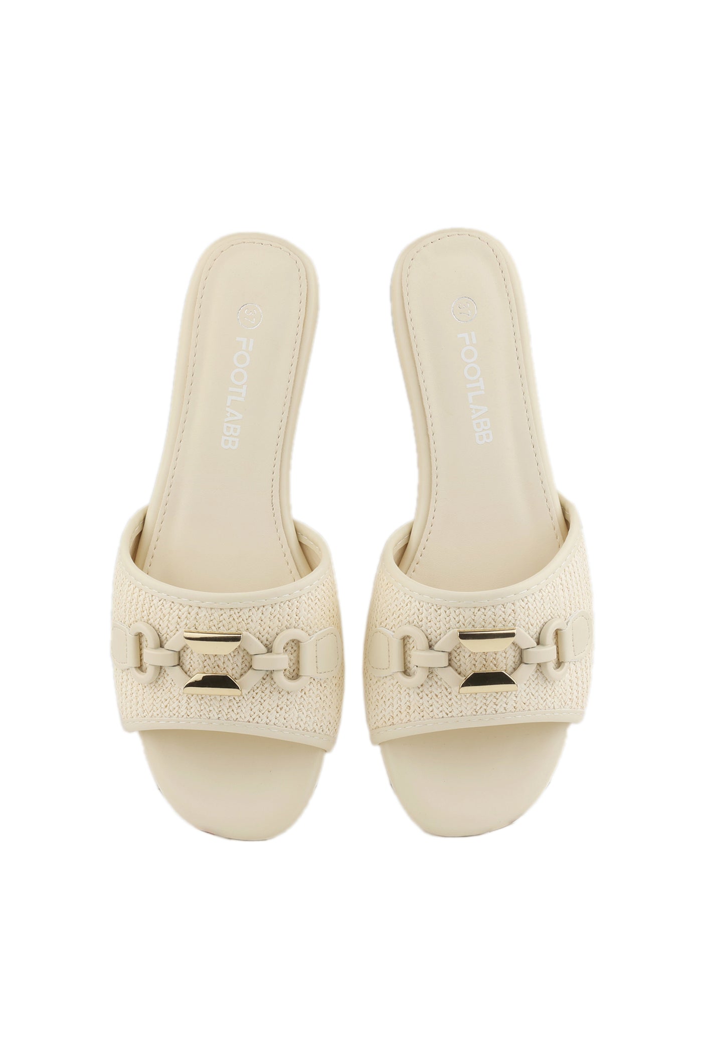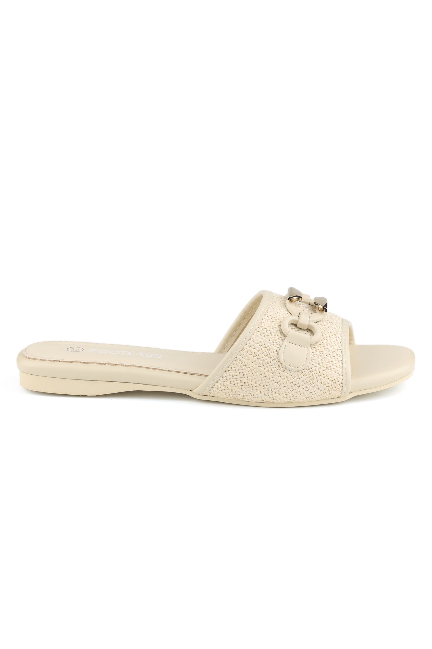 Footlabb women flats, beige slip-on sandals, stylish woven slides, faux leather ladies slippers, Footlabb casual footwear, comfortable silicon sole flats, office wear sandals for women, designer buckle flats, Footlabb trendy slides, lightweight summer footwear, elegant women slippers.